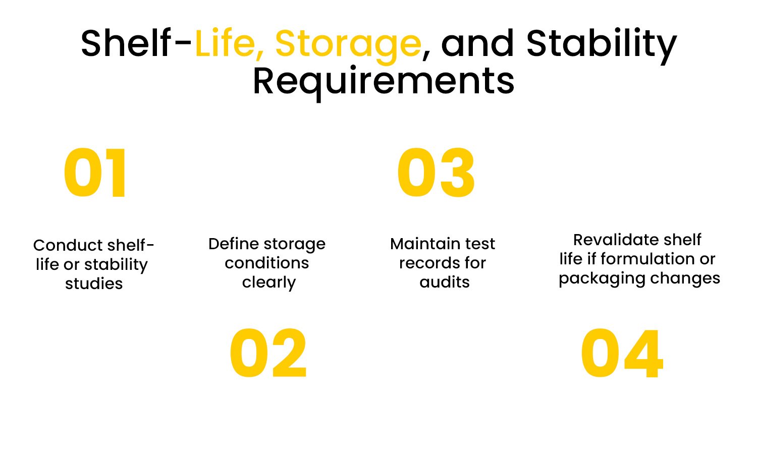 Another critical area of focus is shelf-life validation. FSSAI expects food businesses to justify declared shelf life using scientific data rather than assumptions.Shelf Life Storage and Stability Requirements